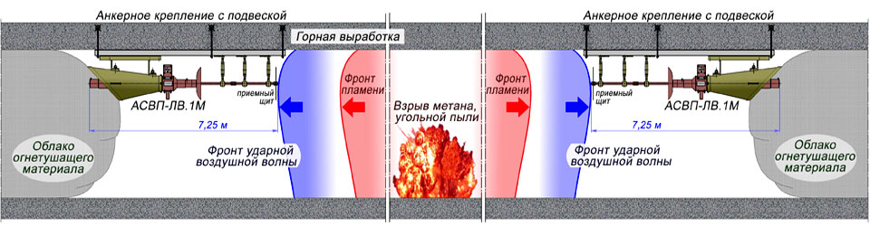 При этом системы, установленные на одном участке выработки, обеспечивают возможность локализации взрывов, направленных как по ходу вентиляционной струи, так и в противоположном направлении.