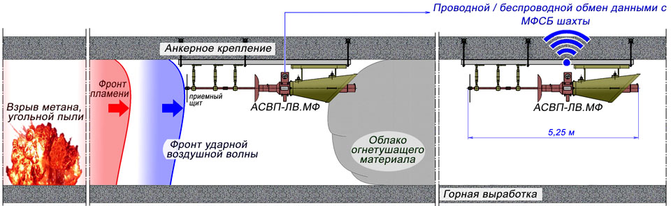 В дальнейшем, автоматическая система работает в ждущем режиме и приводится в действие ударной воздушной волной (УВВ), образованной в результате взрыва метано-пылевоздушной смеси. От воздействия УВВ на приёмный щит происходит динамическое выбрасывание в пространство горной выработки огнетушащего материала энергией сжатого воздуха (газа), находящегося под высоким давлением в рабочей полости системы. В результате в объёме горной выработки по всему её сечению на пути распространения фронта пламени формируется надежный заслон в виде долгоживущего облака огнетушащего материала во взвешенном состоянии. Этот заслон ликвидирует подошедший фронт пламени (гасит его) и прекращает (локализует) процесс распространения взрывов по сети горных выработок.