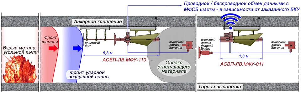 Автоматическая многофункциональная система АСВП-ЛВ.МФУ - инновационная разработка, которая, в зависимости от исполнения может функционировать как средство локализации, так и как средство предупреждения взыва. Она может управляться в составе МФСБ диспечером шахты, либо срабатывать по команде соседних, установленных в горной выработке систем АСВП-ЛВ.МФ или АСВП-ЛВ.МФУ. Также система может оснащаться выносными датчиками ударной волны и специально разработанными и сертифицированными датчиками вспышки метана.