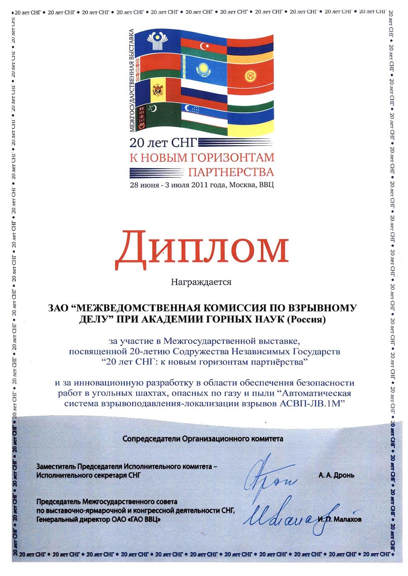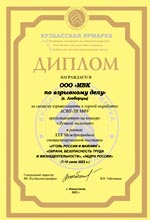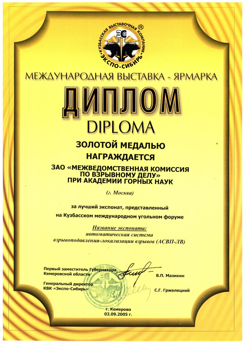 Диплом за инновационную разработку в области обеспечения безопасности работ в угольных шахтах - АСВП-ЛВ.1М