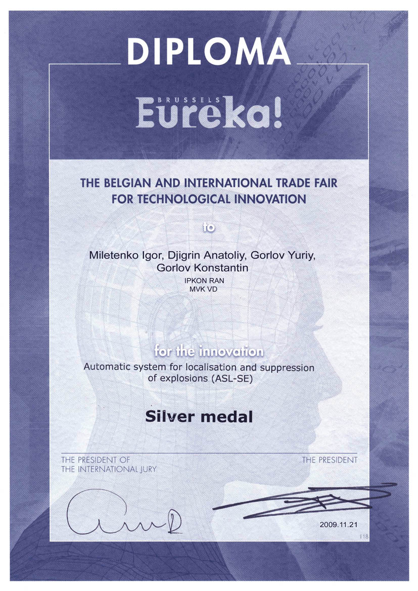 Диплом бельгийской международной выставки технологических инноваций за инновационную разработку АСВП-ЛВ