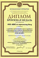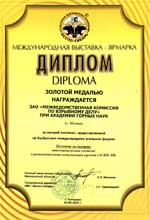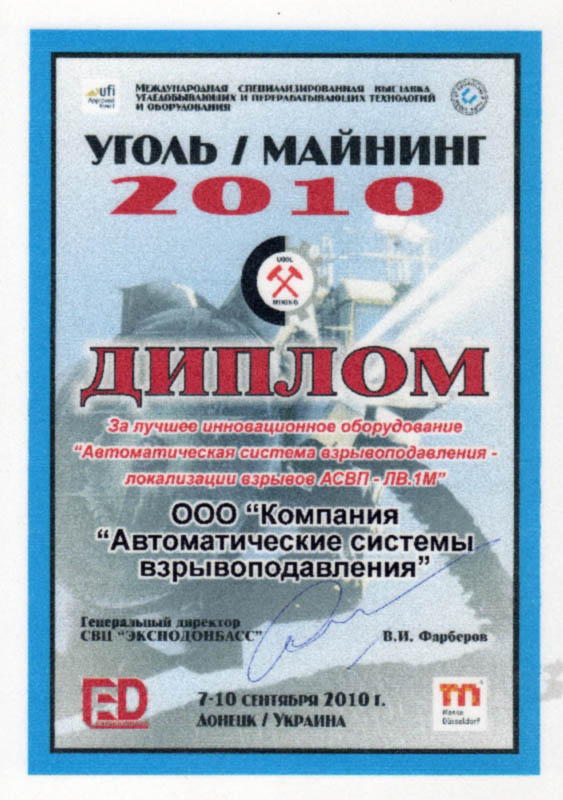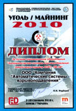 Диплом международной специализированной выставки "Уголь/майнинг-2010" за лучшее инновационное оборудование - АСВП-ЛВ.1М