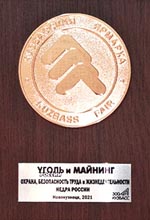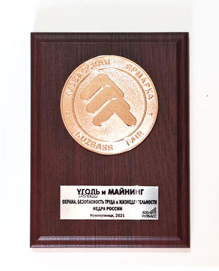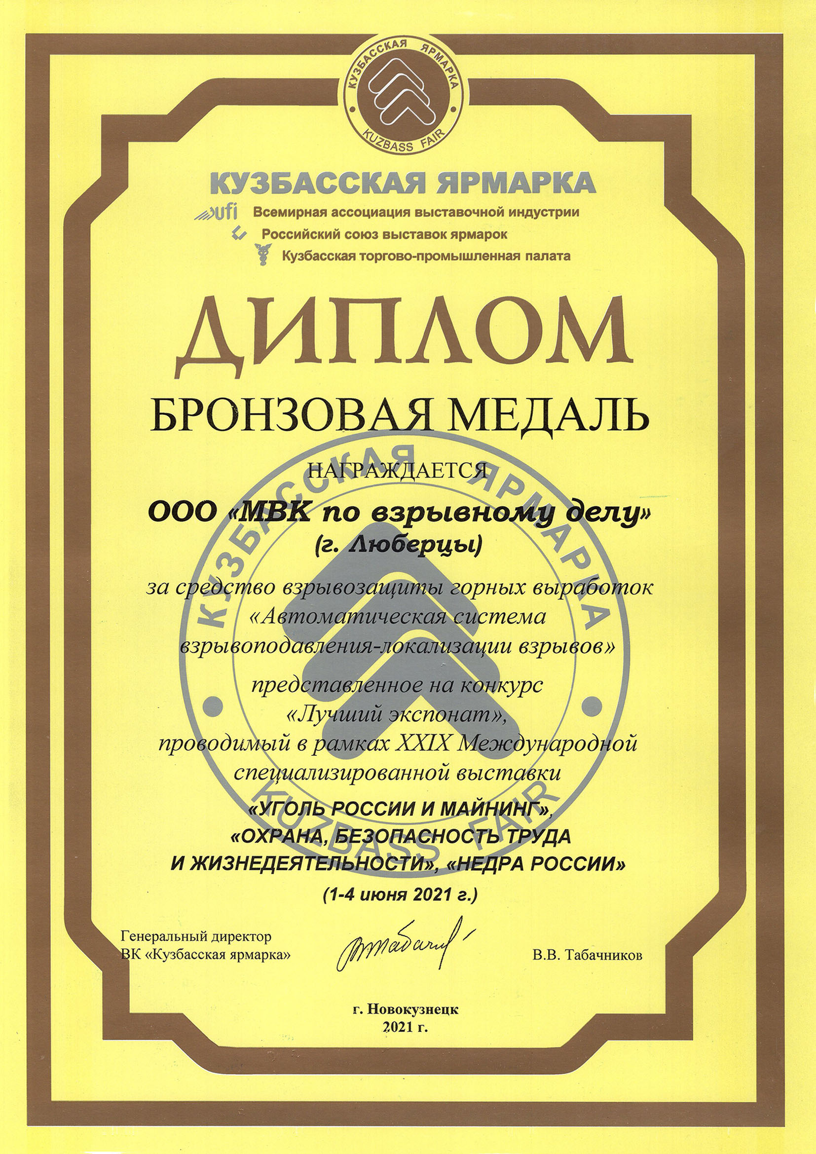 Диплом и бронзовая медаль за средство взрывозащиты горных выработок - АСВП-ЛВ.МФУ на XXIX Международной специализированной выставке "Уголь России и майнинг 2021"