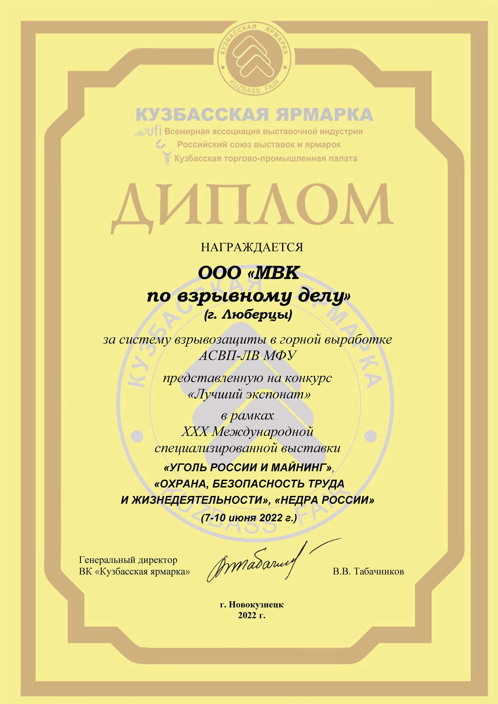 Диплом за средство взрывозащиты горных выработок - АСВП-ЛВ.МФУ на XXX Международной специализированной выставке "Уголь России и майнинг 2022"