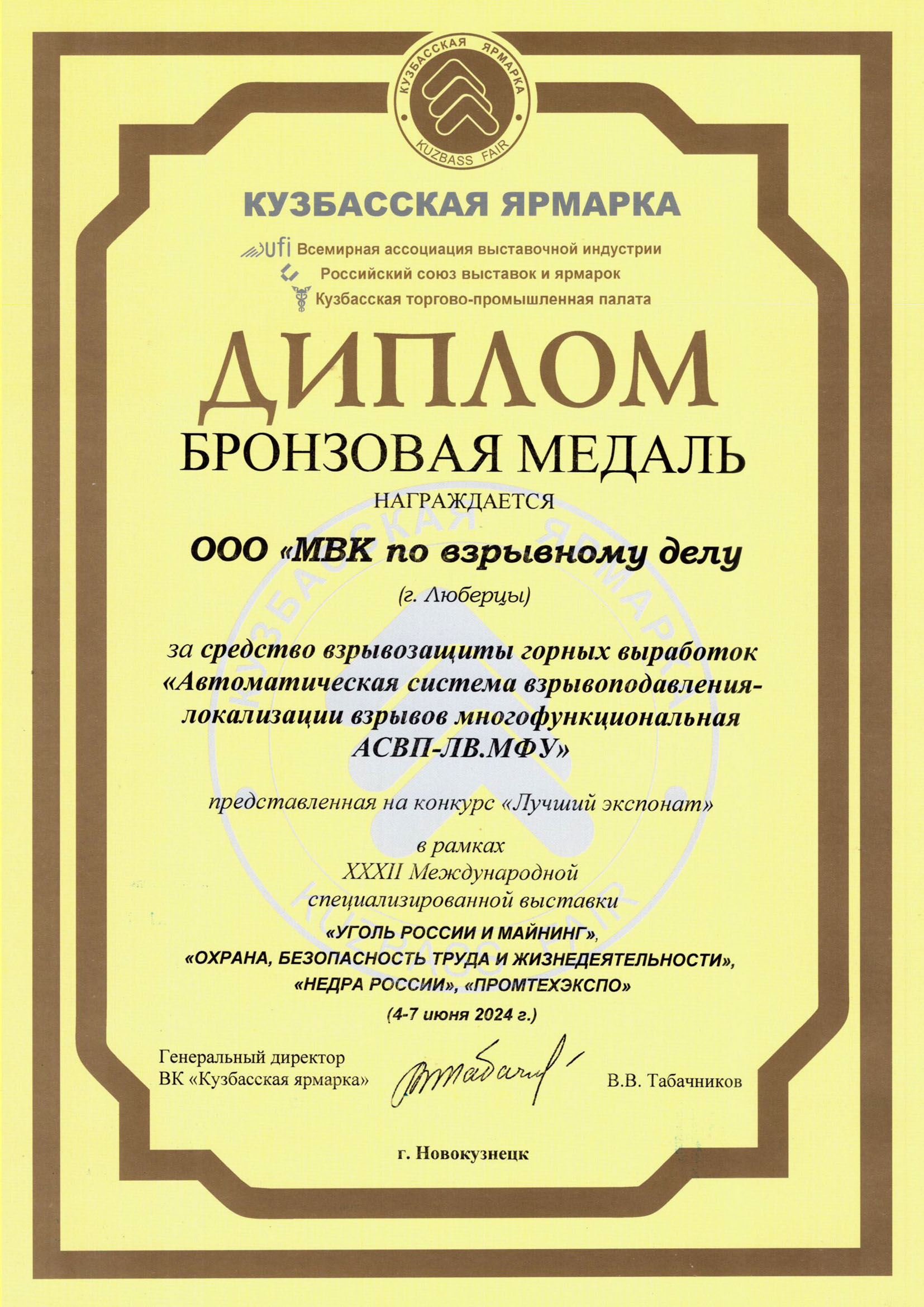 Диплом и бронзовая медаль за средство взрывозащиты горных выработок - АСВП-ЛВ.МФУ на XXXII Международной специализированной выставке "Уголь России и майнинг 2024"